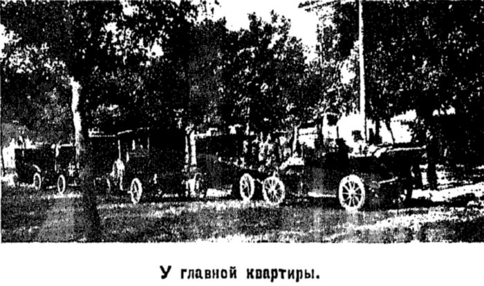 Вотъ, я и въ главной квартирѣ. Здѣсь мозгъ и душа болгарской арміи. Здѣсь царь Фердинандъ живетъ въ трехъ вагонахъ-салонахъ, поставленныхъ на запасный путь. Главная квартира расположена въ гимназіи. Въ нее сходятся телеграфныя проволоки изъ всѣхъ трехъ дѣйствующихъ армій. У подъѣзда въ гимназію неизмѣнно дежуритъ десятокъ автомобилей, ждущихъ приказаній.