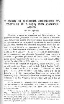 Нѣколко неиздадени документи изъ Венецианската Народна библиотека (Biblioteca Nazionale San Marco) и Ватиканската библиотека даватъ нѣкои интересни сведения въ връзка съ юрисдикцията на охридскитѣ архиепископи къмъ срѣдата на XVI вѣкъ. Четири отъ казанитѣ документи, които ние даваме тукъ въ преписъ, се намиратъ въ сбирката Podocataro въ Венецианската библиотека, именно въ cod. Lat. dass. X. cod. CLXXIV. — L. G. Pélissier, въ своето описание на рѫкописитѣ отъ сбирката Podocataro [1], дава следнитѣ сведения за указания рѫкописъ, въ онази часть, която съдържа казанитѣ документи [2]: cod. Lat. class. X. cod. CLXXIV in fol. Papier, XVe èt XVIe siècle. . . . . . . f. 185. Procès-verbal de l’élection de Paphnuce, moine de Chypre, comme métropolite des Grecs vivant en Italie, faite à Ancône (1543): „1543, de mese d’Aprile 15, in Ancona“. Traduction du texte grec. — f. 187. Lettre du même: „Da Roma, scrivo a di 24 di dic.bre“. — f. 188. L’archevêque Prochoros au métropolite Paphnuce (1548): „Prochoros, miseratione divina archiep. de Prima Iustiniana et de tota Vulgaria, Servia“.