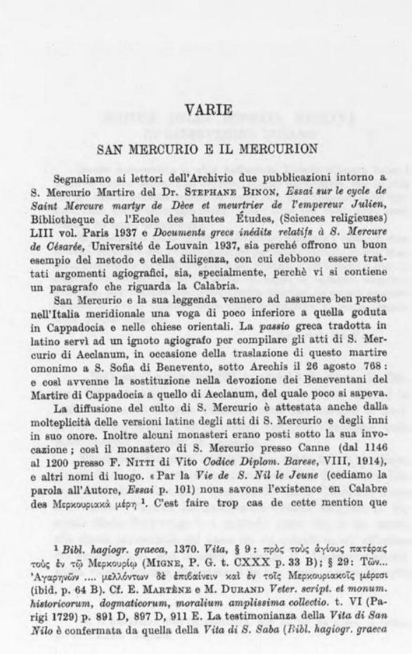 Segnaliamo ai lettori dell’Archivio due pubblicazioni intorno a S. Mercurio Martire del Dr. Stephane Binon, Essai sur le cycle de Saint Mercure martyr de Dèce et meurtrier de l’empereur Julien, Bibliothèque de l’Ecole des hautes Études, (Sciences religieuses) LIII vol. Paris 1937 e Documents grecs inédite relatifs à S. Mercure de Césarée, Université de Louvain 1937, sia perché offrono un buon esempio del metodo e della diligenza, con cui debbono essere trattati argomenti agiografici, sia, specialmente, perchè vi si contiene un paragrafo che riguarda la Calabria.