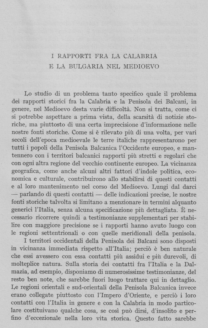 Questo fatto sarebbe forse sufficiente, per se stesso, ad attirare l’attenzione dello studioso verso un tale studio — a porre il problema, a raccogliere e sistemare le notizie disponibili disperse in varie fonti e mai raccolte sino ad oggi. La trattazione di questo problema, anche se in forma piuttosto provvisoria e non esauriente, come viene presentata nelle pagine che seguono, interessa non soltanto la storia nazionale dell’Italia e delle terre bulgare o balcaniche, ma contribuisce a chiarire anche un problema molto più vasto e lungamente discusso — quello dei rapporti fra l’Oriente e l’Occidente nel corso dei secoli di mezzo. In altri termini, ci si dovrebbe porre la domanda, se i territori orientali e sud-orientali della Penisola Balcanica, posti in prossimità della capitale dell'Impero bizantino, erano realmente collegati esclusivamente con Bisanzio e dipendevano, nella loro vita politica, economica e culturale, da Bisanzio e solo da essa, oppure avevano dei contatti anche con l’Occidente, con l’Italia e, in modo speciale, con una delle sue regioni meridionali qual’è la Calabria.