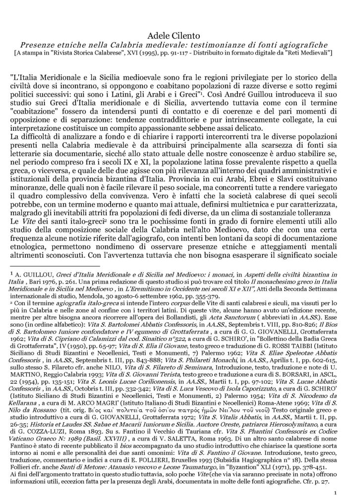 La difficoltà di analizzare a fondo e di chiarire i rapporti intercorrenti tra le diverse popolazioni presenti nella Calabria medievale è da attribuirsi principalmente alla scarsezza di fonti sia letterarie sia documentarie, sicché allo stato attuale delle nostre conoscenze è arduo stabilire se, nel periodo compreso fra i secoli IX e XI, la popolazione latina fosse prevalente rispetto a quella greca, o viceversa, e quale delle due agisse con più rilevanza all’interno dei quadri amministrativi e istituzionali della provincia bizantina d’Italia. Provincia in cui Arabi, Ebrei e Slavi costituivano minoranze, delle quali non è facile rilevare il peso sociale, ma concorrenti tutte a rendere variegato il quadro complessivo della convivenza. Vero è infatti che la società calabrese di quei secoli potrebbe, con un termine moderno e quanto mai attuale, definirsi multietnica e pur caratterizzata, malgrado gli inevitabili attriti fra popolazioni di fedi diverse, da un clima di sostanziale tolleranza Le Vite dei santi italo-greci [2] sono tra le pochissime fonti in grado di fornire elementi utili allo studio della composizione sociale della Calabria nell’alto Medioevo, dato che con una certa frequenza alcune notizie riferite dall’agiografo, con intenti ben lontani da scopi di documentazione etnologica, permettono nondimeno di osservare presenze etniche e atteggiamenti mentali altrimenti sconosciuti.