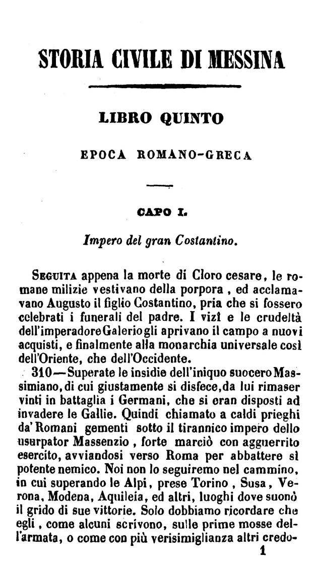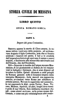 Capo I. Impero del gran Costantino — II. Impero de’ tre figli di Costantino — III. Impero di Giuliano apostata — IV. Impero di Gioviano — V. Impero di Valentiniano, di Valente, e di Graziano — VI. Impero di Graziano, di Valentiniano Juniore, e di Teodosio — VII. Impero di Teodosio, di Valentiniano II e di Arcadio — VIII. Impero di Arcadio, e di Onorio —Vittoria dei Messinesi in Tessalonica — IX. Stilicone ministro in Occidente—Alarico re goto in Italia—Fine di Arcadio e di Onorio — X. Regno di Teodosio il giovine e di Valentiniano III — XI. Impero di Leone, Maiorano e Severo — XII. Regno dei Goti — XIII. Impero di Giustiniano—Prima incursione dei Saracini in Sicilia — XIV. Impero di Giustino, e di Tiberio Costantino — XV. Impero di Maurizio, di Foca, e di Eraclio — XVI. Impero d’Eraclio e di Costantino IV — XVII. Impero di Costante — Seconda incursione dei Saracini in Sicilia — XVIII. Impero di Costantino Pagonato — XIX. Impero di Giustiniano II, di Leonzio e di Absimero — XX. Impero di Filippico, di Anastasio, di Teodosio, e di Leone Isaurico — XXI. Impero di Costantino Copronico, di Leone IV, d’Irene, e di Costantino VI — XXII. Impero di Niceforo, e di Michele Curopolato — XXIII. Cittadinanza romana—Leggi—Costumi — XXIV. Magistrati in quest’epoca — XXV. Agricoltura—Commercio—Zecche — XXVI. Arti—Scienze—Uomini illustri — XXVII. Lingue che si parlarono nell’epoca romano-greca — XXVIII. Religione — XXIX. Ordine monastico e regolare — XXX. Martiri messinesi in quest’epoca — XXXI. Intorno la storia e privilegio di Arcadio — XXXII. Intorno l’origine e storia del duomo di Messina