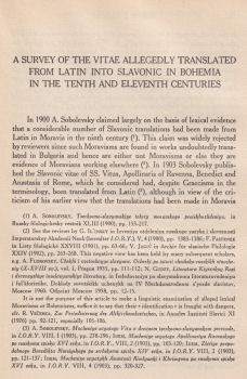 In 1900 A. Sobolevsky claimed largely on the basis of lexical evidence that a considerable number of Slavonic translations had been made from Latin in Moravia in the ninth century (1). This claim was widely rejected by reviewers since such Moravisms are found in works undoubtedly translated in Bulgaria and hence are either not Moravisms or else they are evidence of Moravians working elsewhere (2). in 1903 Sobolevsky published the Slavonic vitae of SS. Vitus, Apollinaris of Ravenna, Benedict and Anastasia of Rome, which he considered had, despite Graecisms in the terminology, been translated from Latin (3), although in view of the criticism of his earlier view that the translations had been made in Moravia in the ninth century