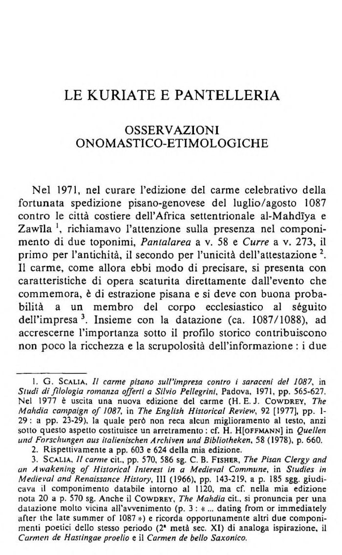 1. G. Scalia, Il carme pisano sull’impresa contro i saraceni del 1087, in Studi di filologia romanza offerti a Silvio Pellegrini, Padova, 1971, pp. 565-627. Nel 1977 è uscita una nuova edizione del carme (H.E. J. Cowdrey, The Mahdia campaign of 1087, in The English Historical Review, 92 [1977], pp. 129 : a pp. 23-29), la quale però non reca alcun miglioramento al testo, anzi sotto questo aspetto costituisce un arretramento : cf. H. H[offmann] in Quellen und Forschungen aus italienischen Archiven und Bibliotheken, 58 (1978), p. 660.