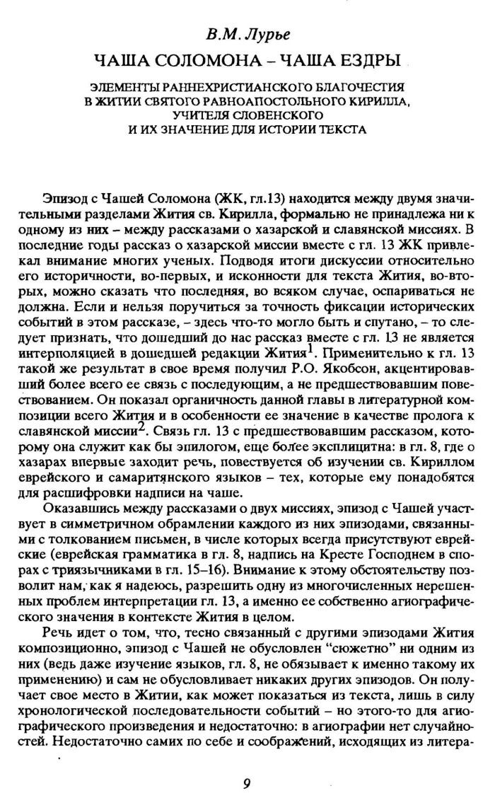 Эпизод с Чашей Соломона (ЖК, гл. 13) находится между двумя значительными разделами Жития св. Кирилла, формально не принадлежа ни к одному из них - между рассказами о хазарской и славянской миссиях. В последние годы рассказ о хазарской миссии вместе с гл. 13 ЖК привлекая внимание многих ученых. Подводя итоги дискуссии относительно его историчности, во-первых, и исконности для текста Жития, во-вторых, можно сказать что последняя, во всяком случае, оспариваться не должна. Если и нельзя поручиться за точность фиксации исторических событий в этом рассказе, - здесь что-то могло быть и спутано, - то следует признать, что дошедший до нас рассказ вместе с гл. 13 не является интерполяцией в дошедшей редакции Жития [1]. Применительно к гл. 13 такой же результат в свое время получил Р.О. Якобсон, акцентировавший более всего ее связь с последующим, а не предшествовавшим повествованием. Он показал органичность данной главы в литературной композиции всего Жития и в особенности ее значение в качестве пролога к славянской миссии [2]. Связь гл. 13 с предшествовавшим рассказом, которому она служит как бы эпилогом, еще более эксплицитна: в гл. 8, где о хазарах впервые заходит речь, повествуется об изучении св. Кириллом еврейского и самаритянскою языков - тех, которые ему понадобятся для расшифровки надписи на чаше.