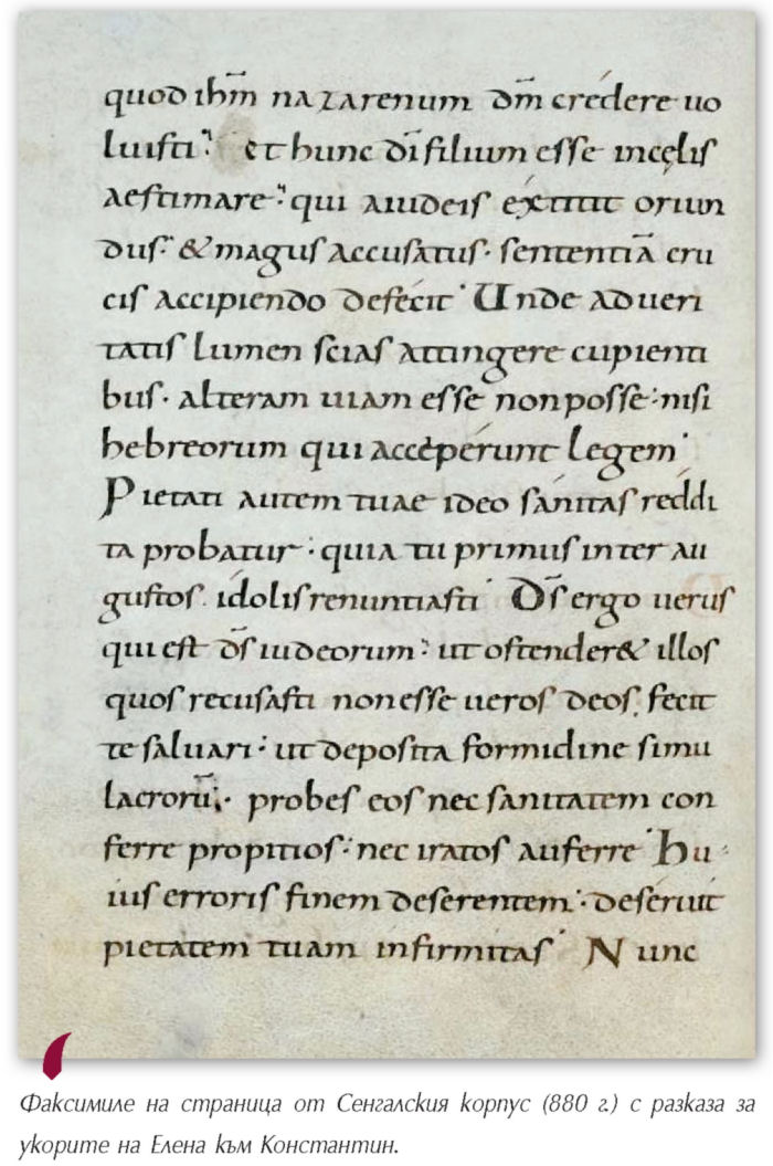 - Факсимиле на страница от Сенгалския корпус (880 г.) с разказа за укорите на Елена към Константин 19