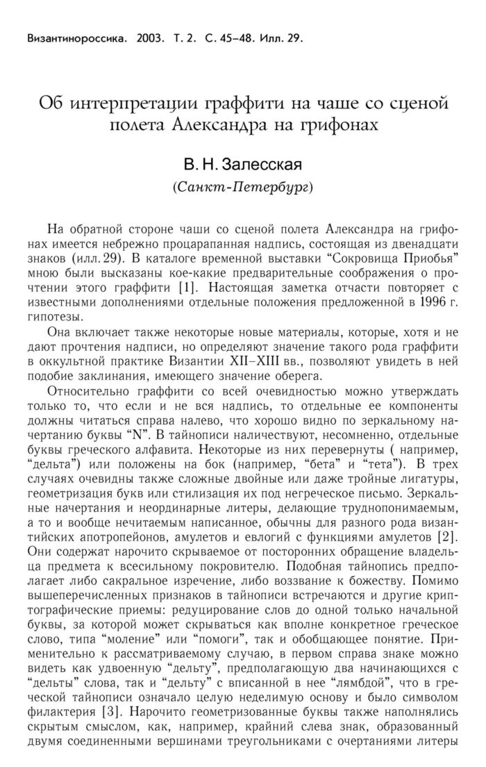 Об интерпретации граффити на чаше со сценой полета Александра на грифонах В. Н. Залесская (Санкт-Петербург)