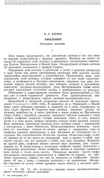 Столь же убежденно выступил другой кавказовед прошлого века, В. Б. Пфафф, впрочем, почти дословно повторивший (без ссылки! — М. К.) Шопена. «Многие писатели, — писал Пфафф, — считают амазонок народом мифическим, ...но об них говорится в столь многих и разнообразных источниках древней истории, что можно и не сомневаться в их существовании». И Пфафф в свою очередь предлагает объяснение происхождения амазонок, повторяя Шопена и присоединяя некоторые собственные домыслы [70]. Со специальной статьей, посвященной опровержению взглядов Шопена и Пфаффа, выступил Е. Г. Вейденбаум [71]. Попытку объяснить античную легенду в ее связи с Кавказом сделал П. К. Услар. Основу для этой легенды составляли для греков сведения об определенном народе, а именно, о каппадокийцах Малой Азии, с их вооруженными гиеродулами. При последующем непосредственном знакомстве с каппадокийцами, греки, не найдя в них подлинных амазонок, решили, что они переселились в другую страну и отнесли их местопребывание не то к Скифии, не то к Кавказу. Узнав в свою очередь о существовании в этих странах народов, управляемых царицами, народов, у которых женщины ездят на конях, владеют луком и стрелами, одеваются по-мужски и пр., узнав о черкесском обычае бинтования у женщин груди, греки нашли в этом подтверждение своих предположений. Услар указывает далее на соответствующий кавказский фольклор, однако, как это связывается с античной традицией, не объясняет [72].