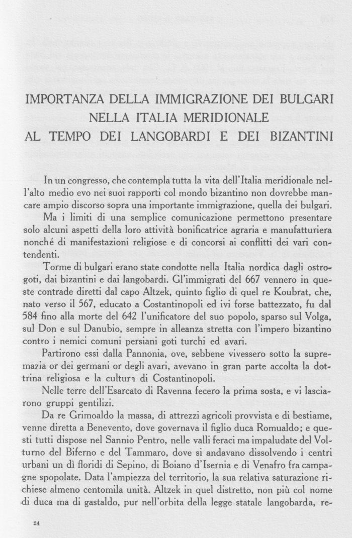 In un congresso, che contempla tutta la vita dell’Italia meridionale nell’alto medio evo nei suoi rapporti col mondo bizantino non dovrebbe mancare ampio discorso sopra una importante immigrazione, quella dei bulgari.