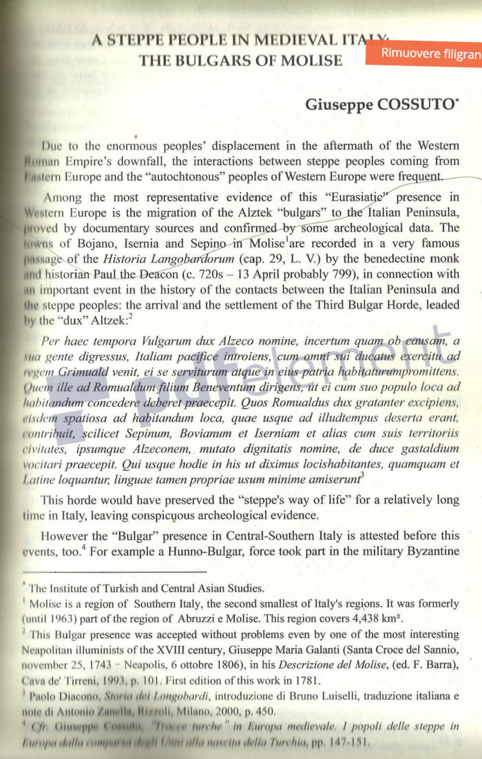 Among the most representative evidence of this “Eurasiatic” presence in Western Europe is the migration of the Alztek “bulgars” to the Italian Peninsula, proved by documentary sources and confirmed by some archeological data. The towns of Bojano, Isernia and Sepino in Molise [1] are recorded in a very famous passage of the Historia Langobardorum (cap. 29, L. V.) by the benedectine monk and historian Paul the Deacon (c. 720s - 13 April probably 799), in connection with an important event in the history of the contacts between the Italian Peninsula and the steppe peoples: the arrival and the settlement of the Third Bulgar Horde, leaded by the “dux” Altzek: [2]