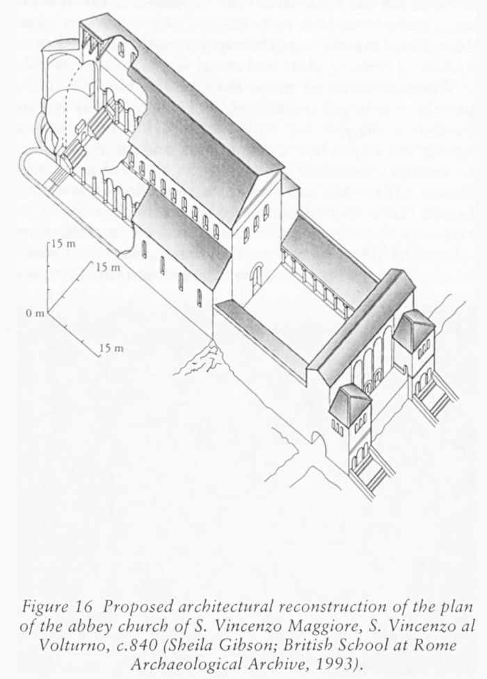 Figure 16 Proposed architectural reconstruction of the plan of the abbey church of S. Vincenzo Maggiore, S. Vincenzo al Volturno, c.840 (Sheila Gibson; British School at Rome Archaeological Archive, 1993).