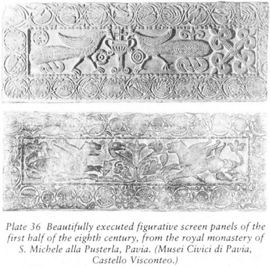 Plate 36 Beautifully executed figurative screen panels of the first half of the eighth century, from the royal monastery of S. Michele alla Pusterla, Pavia. (Musei Civici di Pavia, Castello Visconteo.)