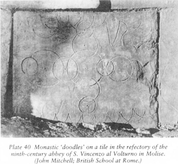 Plate 40 Monastic 'doodles’ on a tile in the refectory of the ninth-century abbey of S. Vincenzo al Volturno in Molise. (John Mitchell; British School at Rome.)