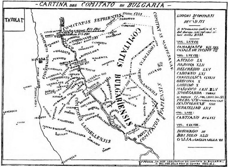 Chiudendo la parentesi tre documenti dunque nominativi soltanto, tre località diocesane novaresi, al di qua del Ticino; onde i subalpini senz’altro presunsero od impostarono la Bulgaria tra il fiume ed il contado di Vercelli, divisi tuttavia da un effimero dissenso sul possibile capoluogo (16) originario, che dapprima parve a taluno, forse per l’iniziale consonanza del vocabolo, individuabile in Borgolavezzaro (17).