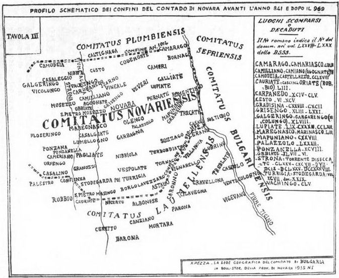 (22) A. Colombo, opere citate. La cartina correda il lavoro La battaglia al Ticino p. 156 ed è intitolala Il Municipio di Viccolonne e il comitato di Bulgaria. Sono inseriti nel comitato Ganibolò, Bercleda, Vigevano, Viccolonne, Olevano, Ceretto, Morlara, Pariona, Cilavegna, Gravellona, Petrorium, Cassolo, Villanova, Albonese, Tornaco, Nicorvo, Robbio, Rosasco, Rivoltella, Palestro, Vinzaglio Confienza, Bulgaro, Casalino, Casalvolone, Olfengo, Granozzo, Stodegarda, Vespolate, Borgolavezzaro, Terdobbiate, Sozzago, Cerano, Trecate, Bornago, Lubrino (entità territoriale autonoma, di cui in docc. novaresi dell’866 e del 902, odierno cascinale di Cassolnovo, deformato da errate letture paleografiche in Cubruro).