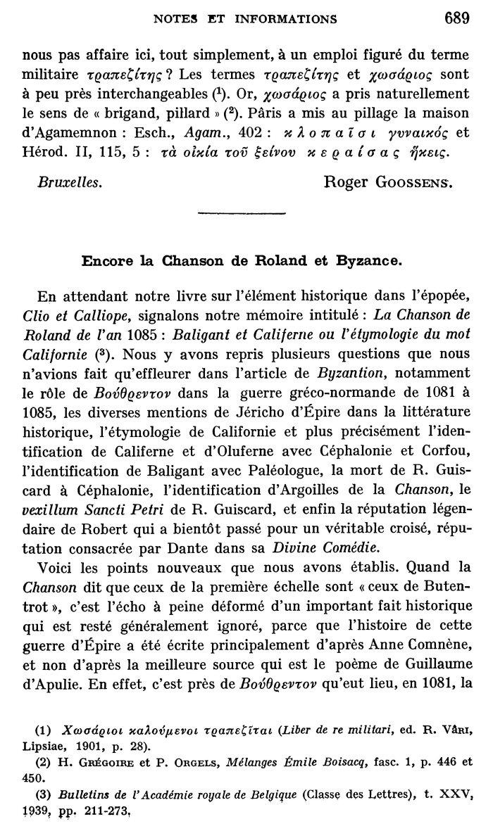 En attendant notre livre sur l’élément historique dans l’épopée, Clio et Calliope, signalons notre mémoire intitulé : La Chanson de Roland de l’an 1085 : Baligant et Califerrie ou l’étymologie du mot Californie (3). Nous y avons repris plusieurs questions que nous n’avions fait qu’effleurer dans l’article de Byzantion, notamment le rôle de Βούθρεντον dans la guerre gréco-normande de 1081 à 1085, les diverses mentions de Jéricho d’Épire dans la littérature historique, l’étymologie de Californie et plus précisément l’identification de Califerne et d’Oluferne avec Céphalonie et Corfou, l’identification de Baligant avec Paléologue, la mort de R. Guiscard à Céphalonie, l’identification d’Argoilles de la Chanson, le vexillum Sancti Pétri de R. Guiscard, et enfin la réputation légendaire de Robert qui a bientôt passé pour un véritable croisé, réputation consacrée par Dante dans sa Divine Comédie.