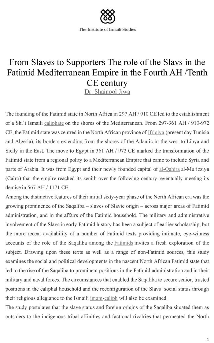 The Institute of Ismaili Studies (IIS) (an edited version of the article The Roles of the Slavs in the Fatimid Mediterranean Empire in the Fourth Century/Tenth Century, Mediaeval Studies 77 (2015): 103-25)