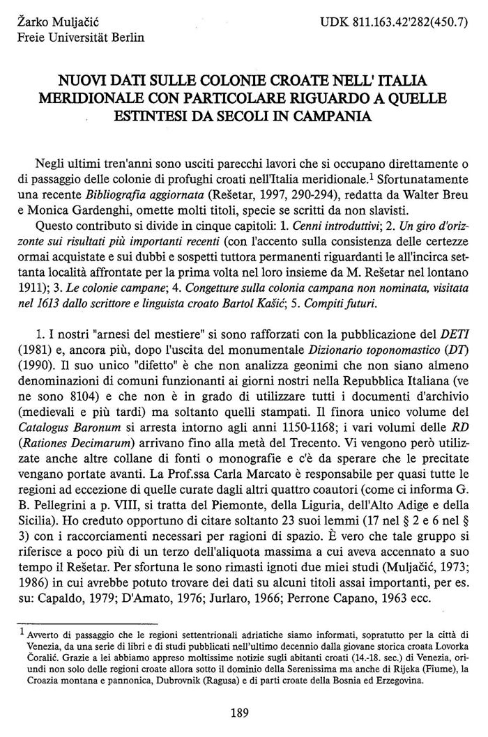 DE GIOVANNI, Marcello (1987), "Il contributo della toponomastica al problema della presenza slava nell'area medioadriatica centrale", in: Holtus, Gùnter / Kramer, Johannes (a cura di), Romània e Slavia Adriatica. Festschrift für Žarko Muljačić, Hamburg, Helmut Buske Verlag, 431-454.