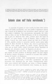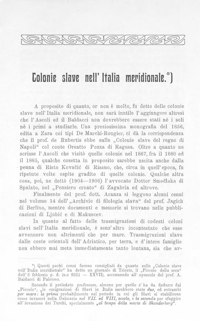*. Questi pochi cenni furono consigliati da quanto sulle „Colonie slave nell’ Italia meridionale" ha detto un giornale di Trieste, il „Piecolo della sera" dell’8 febbraio p. d. (n.o 9521 — XXVII), accennando ali opuscolo del prof. A. Baldacci di Palermo.