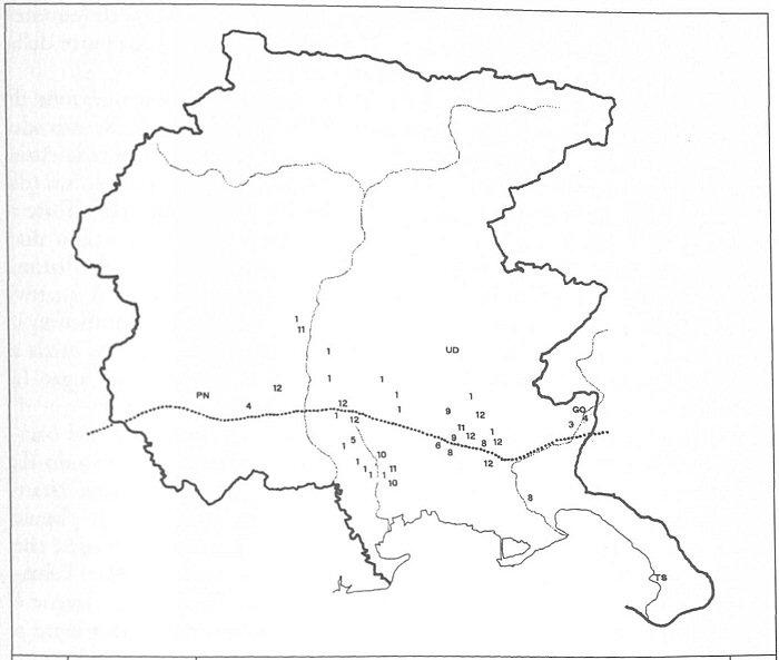 (13) Njiva descrive il “campo chiuso” e attualmente colonizza le aree prealpine delle Valli di Resia, del Torre e del Natisone. L’areale giuliano conta le proprie presenze lungo il Carso triestino nelle zone di Sistiana e a ridosso di Trieste.