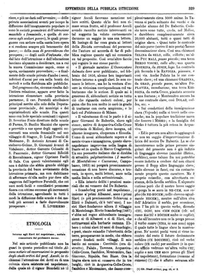 «Il valentuomo di cui le parlo è il signor Giovanni de Rubertis, slavo egli stesso, nativo di Acquaviva-Colle-Croce (provincia di Molise), dove insegna, od almeno insegnava, eloquenza e filosofia. Uomo di assai abbondante sapere e di mente vivace e immaginosa, questo slavo-napoletano improvvisa nella lingua di Dante ed in quella di Marco Craglievich. Un suo poemetto italiano che si direbbe di attualità palpitantissima (I martiri di Montefalcone e Caccavone, Campobasso, 1863) mi porgerà prossimamente occasione di non breve discorso, e troverà, io spero, molti lettori, anco nella media Italia e nella settentrionale.