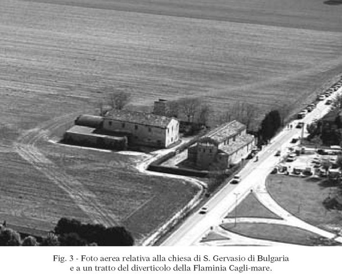 Fig. 3 - Foto aerea relativa alla chiesa di S. Gervasio di Bulgaria e a un tratto del diverticolo della Flaminia Cagli-mare.