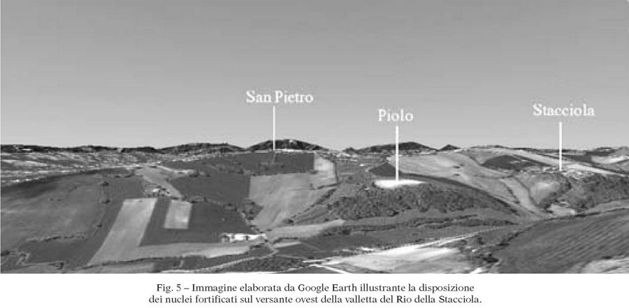 Fig. 5 - Immagine elaborata da Google Earth illustrante la disposizione dei nuclei fortificati sul versante ovest della valletta del Rio della Stacciola.
