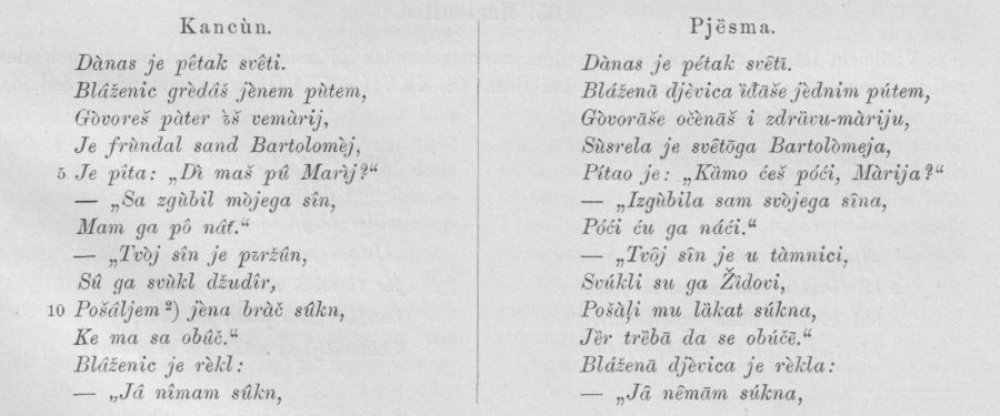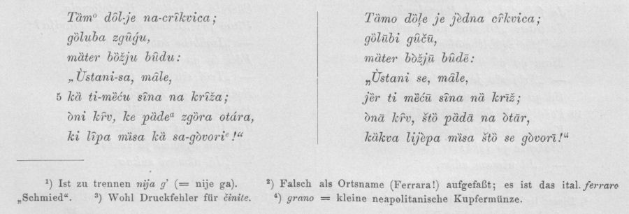 Man kann schließlich zu den „Liedern“ auch folgendes Stück nehmen, das bei Barač (S. XXIII) vorkommt und auch ich, vielleicht von demselben alten Manne, hörte, da die beiden Texte vollkommen übereinstimmen.