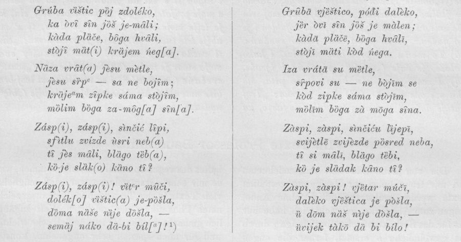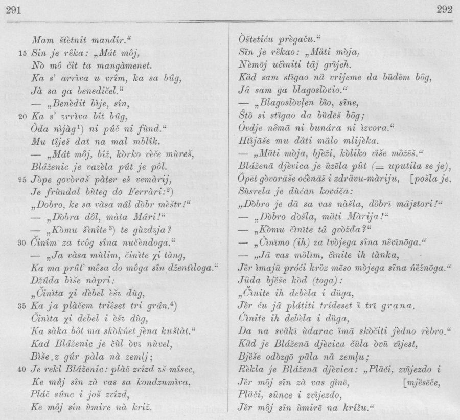 Bei Barač lautet aber die letzte Zeile: „ki lipa misa vel’ka kâ se zdvize!“; Smodlaka wiederum hat (in seinen handschriftlichen Notizen) anstatt der zwei letzten Verse folgende drei: