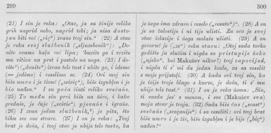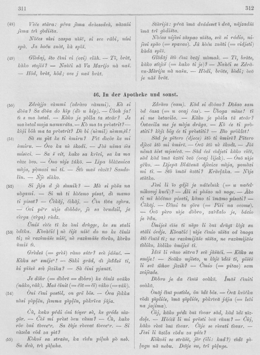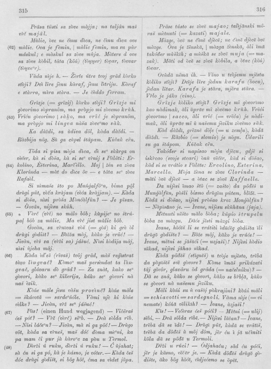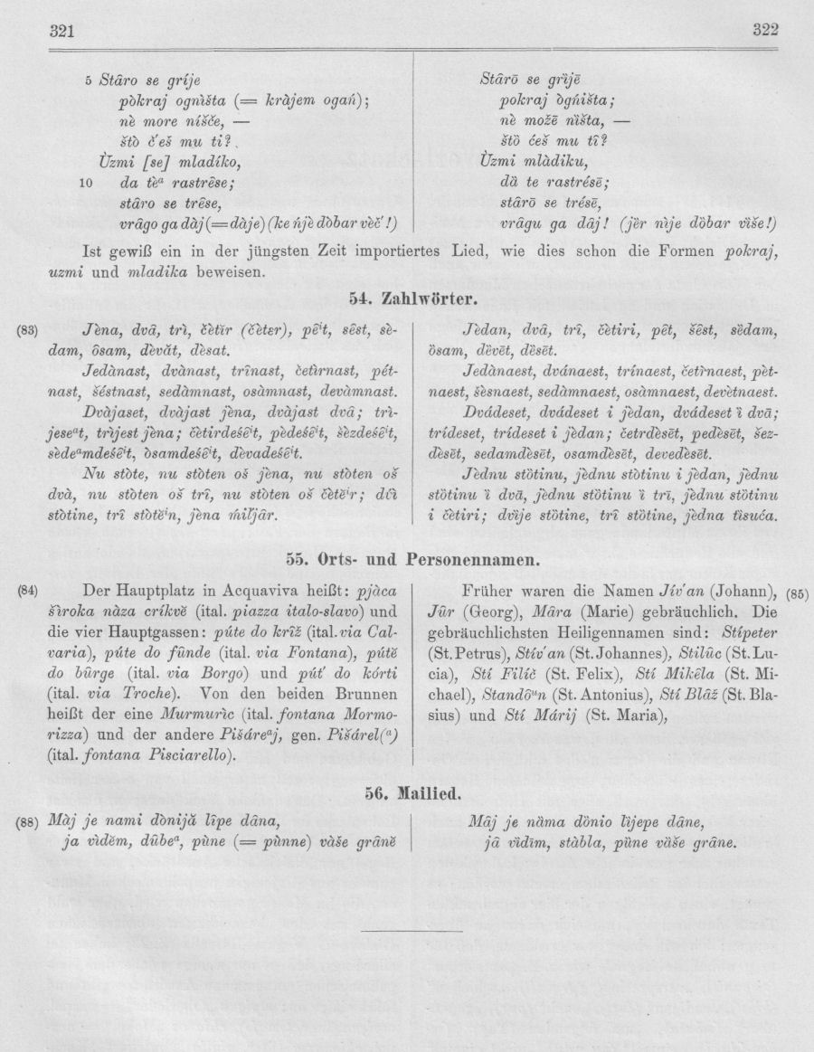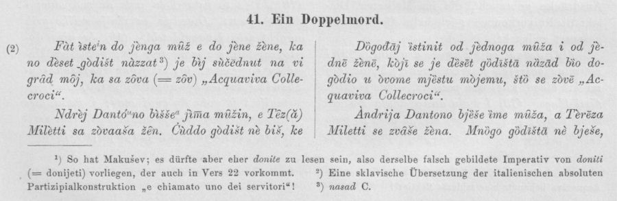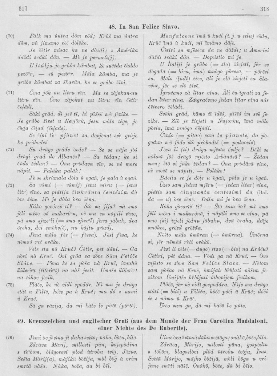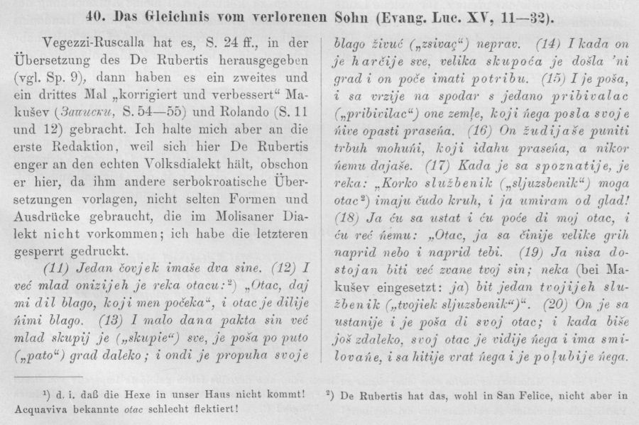 Vegezzi-Ruscalla hat es, S. 24 ff., in der Übersetzung des De Rubertis herausgegeben (vgl. Sp. 9), dann haben es ein zweites und ein drittes Mal „korrigiert und verbessert“ Makušev (Записки, S. 54—55) und Rolando (S. 11 und 12) gebracht. Ich halte mich aber an die erste Redaktion, weil sich hier De Rubertis enger an den echten Volksdialekt hält, obschon er hier, da ihm andere serbokroatische Übersetzungen Vorlagen, nicht selten Formen und Ausdrücke gebraucht, die im Molisaner Dialekt nicht Vorkommen; ich habe die letzteren gesperrt gedruckt.
