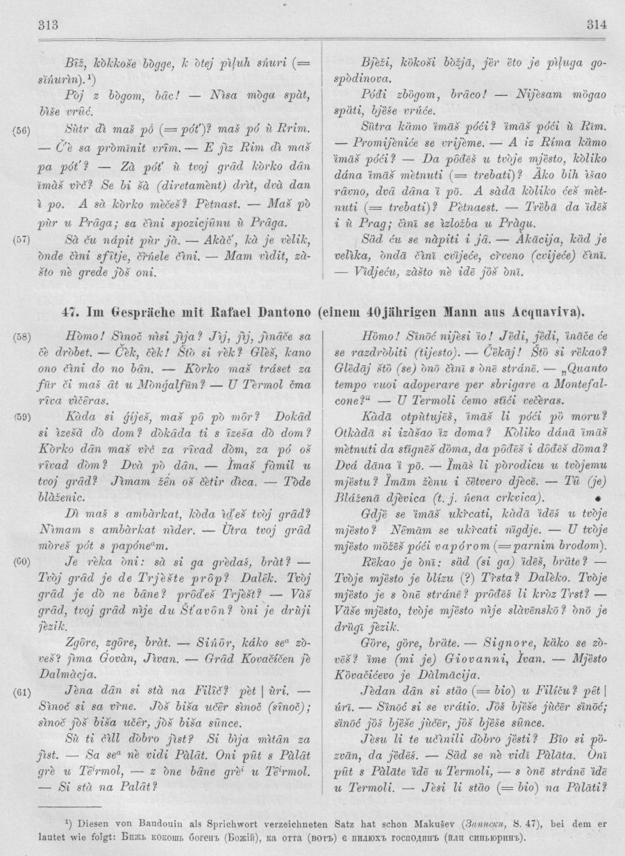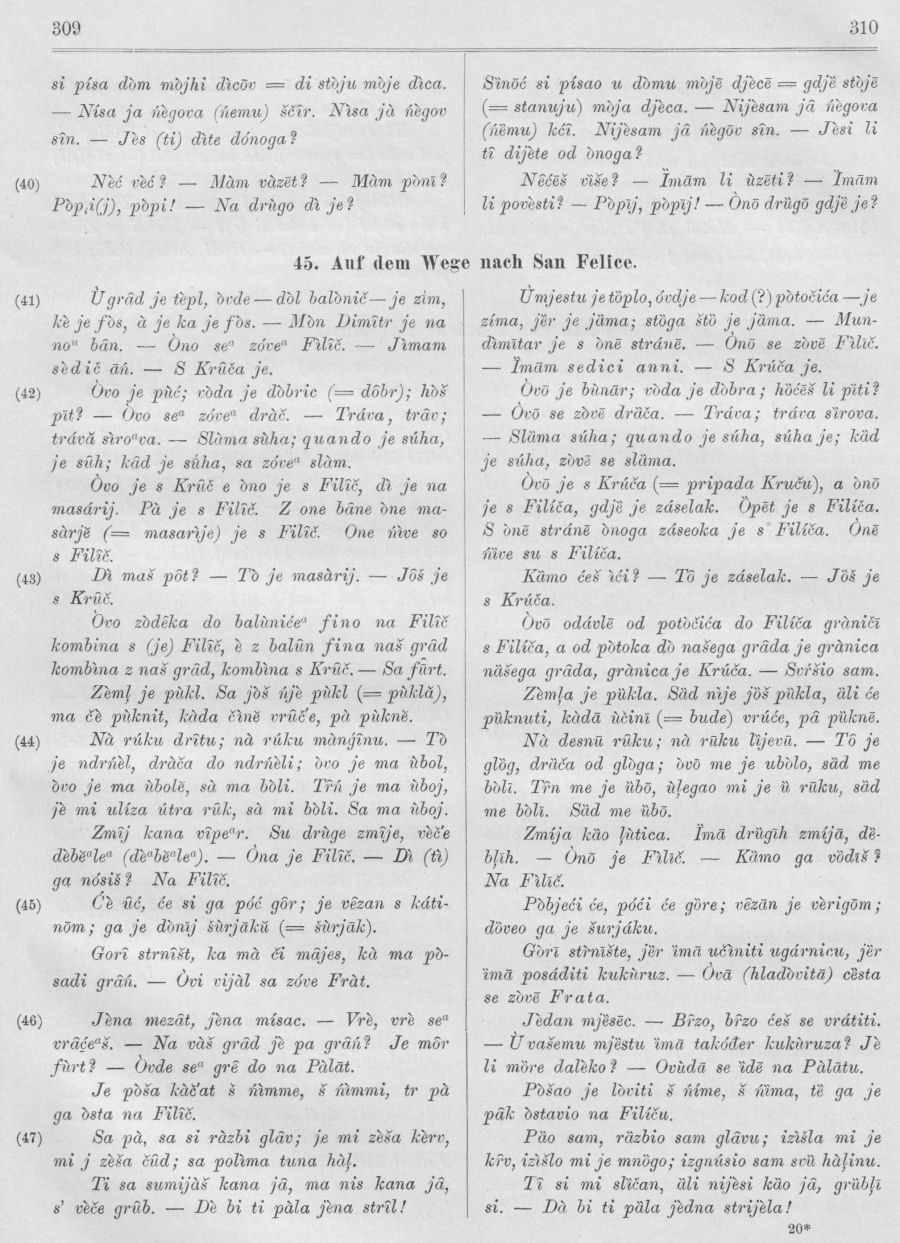 Die von Prof. Baudouin aufgezeichneten und mir freundlichst zur Verfügung gestellten ; Texte werden selbstverständlich ohne Änderungen zum Abdrucke gebracht; ich habe nur das für das Serbokroatische überflüssige χ durch das gewöhnliche h ersetzt, ferner die engen Vokale e - o, sowie das breite e, für welche Laute Baudouin die Zeichen є - ω - э verwendete, wie in meinen Texten mit ei - ou - ea bezeichnet. Die beiden Erzählungen sub Nr. 41 und 42 hat Baudouin so niedergeschrieben, wie sie ihm vom nunmehr verstorbenen Giuseppe Chiavaro, Apotheker in Acquaviva, nach einem Manuskripte , vorgelesen wurden, in welchem Herr Chiavaro diese Erzählungen sich notiert hatte. Die kleineren Texte hat Baudouin selbst aus dem Gespräche mit den Kolonisten aufgezeichnet und ich habe sie trotz ihres nicht allzu wichtigen Inhaltes deswegen vollinhaltlich aufgenommen, weil es mir sehr daran gelegen war, daß möglichst viele Texte in der Transkription des ausgezeichneten Phonetikers der gelehrten Welt zugänglich gemacht werden; es ist nämlich sehr wichtig und für mich speziell sehr angenehm, konstatieren zu können, daß meine Aufzeichnung des Molisaner Dialektes mit derjenigen Baudouins vollkommen übereinstimmt. Auf der Seite habe ich mit eingeklammerten Zahlen die Seiten der Handschrift Baudouins deswegen bezeichnet, weil ich im grammatischen Teile oft Beispiele aus diesen Texten zitiere und es aus technischen Gründen nicht möglich war, das ganze Werk im Satze zu behalten. In den Anmerkungen sind mit dem Buchstaben C einige Varianten verzeichnet, die sich in der Originalhandschrift des Herrn Chiavaro befanden.