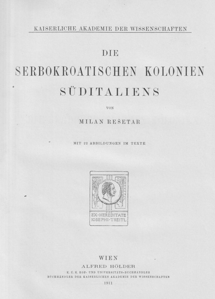 § 1. Gegenwärtige slawische Siedlungen in Italien — § 2. Entdeckung der süditalienischen Slawen; M. Pucić und G. De Rubertis — § 3. Comparetti, Ascoli, Vegezzi-Ruscalla — § 4. Makušev und Drinov; Rolando; Kobelt — § 5. Kovačić; Hanusz; Aranza; Baudouin — § 6. Smodlaka und Barač; Baldacci; Gelcich; Rešetar (Spalte 1)