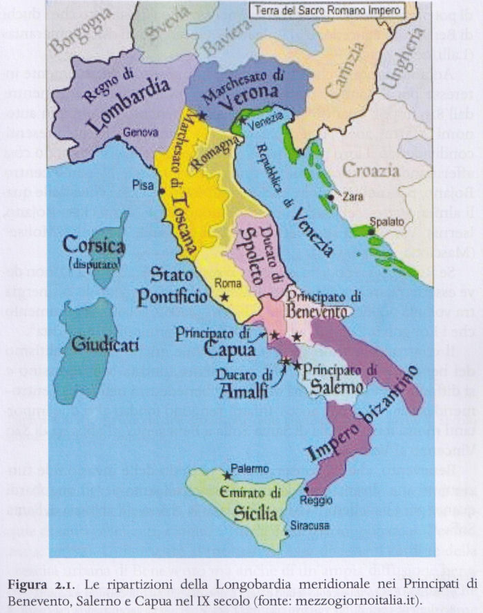 - Figura 2.1. Le ripartizioni della Longobardia meridionale nei Principati di Benevento, Salerno e Capua nel IX secolo