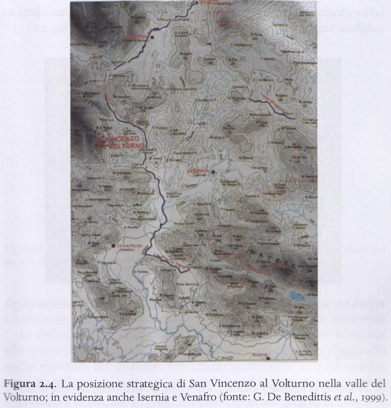 Figura 2.4. La posizione strategica di San Vincenzo al Volturno nella valle del Volturno; in evidenza anche Isernia e Venafro (fonte: G. De Benedittis et al, 1999).
