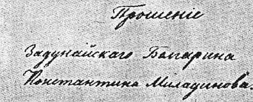 — С дата 8 юни 1858 г. българските първенци от Кукуш, Дойран и Карадаг се обръщат с прошение към руския император, като молят да се разреши събирането на помощи в Русия за откриването на българска гимназия в Кукуш и за обзавеждането на български църкви в трите епархии. Подписът на Димитър Миладинов, заедно с подписите на още 29 българи от посочените градове — стои под това прошение до руския император. Приведените по-долу редове са от заключителния пасаж на прошението: „Това наше смирено прошение не носи подписи нито на архиерей, нито на вселенски патриарх за потвърждение на истината, но ние призоваваме за почтени свидетели на тези молби свещената съвест и архимандрит Партений Зографски, който се е учил в Русия, а сега е свещенослужител в църквата при Руското посолство и ръководи българското училище в Цариград, мъж нам еднороден и съотечественик".