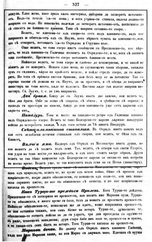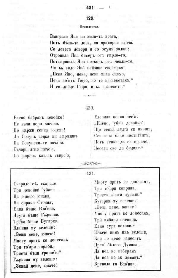 Многоуважаемият А. Хилфердинг, като направил обиколка в Призрен, е намерил там немалко български пергаментови ръкописи. Аз му изпратих чрез един сърбин от Барчи, Ст. Веркович, службата на светите български седмочисленици на гръцки език и тридесет и девет български песни от различни градове на Македония.