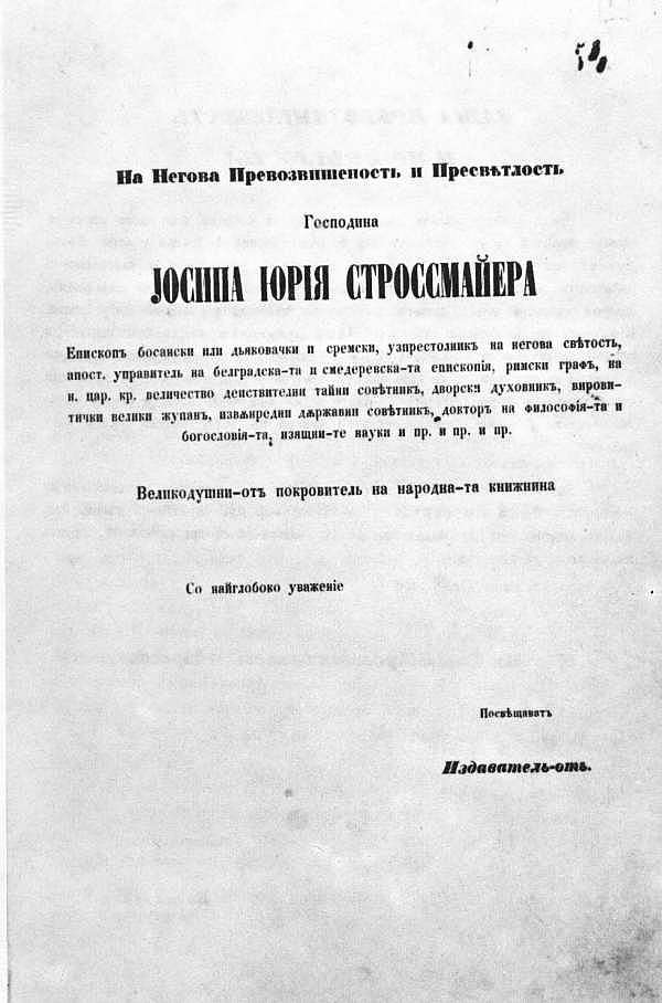 „С дължимата дан на най-дълбоко уважение имам честта да поднеса на Ваше Превъзходителство приложения тук български препис, запазен от забвение в края на едно старо българско евангелие, и един лист от друг също така български ръкопис, намиращ се в моето родно място Струга, Охридска епархия ...
