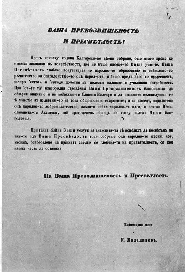 Моят брат К. Хр. Миладинов, след като се завърна от Атинския университет, преди година и половина замина за Москва да изучи славянските езици и др., и с благосклонната подкрепа на уважаеми лица има намерение да издаде най-напред българско-македонски песни, приказки, пословици и гатанки.
