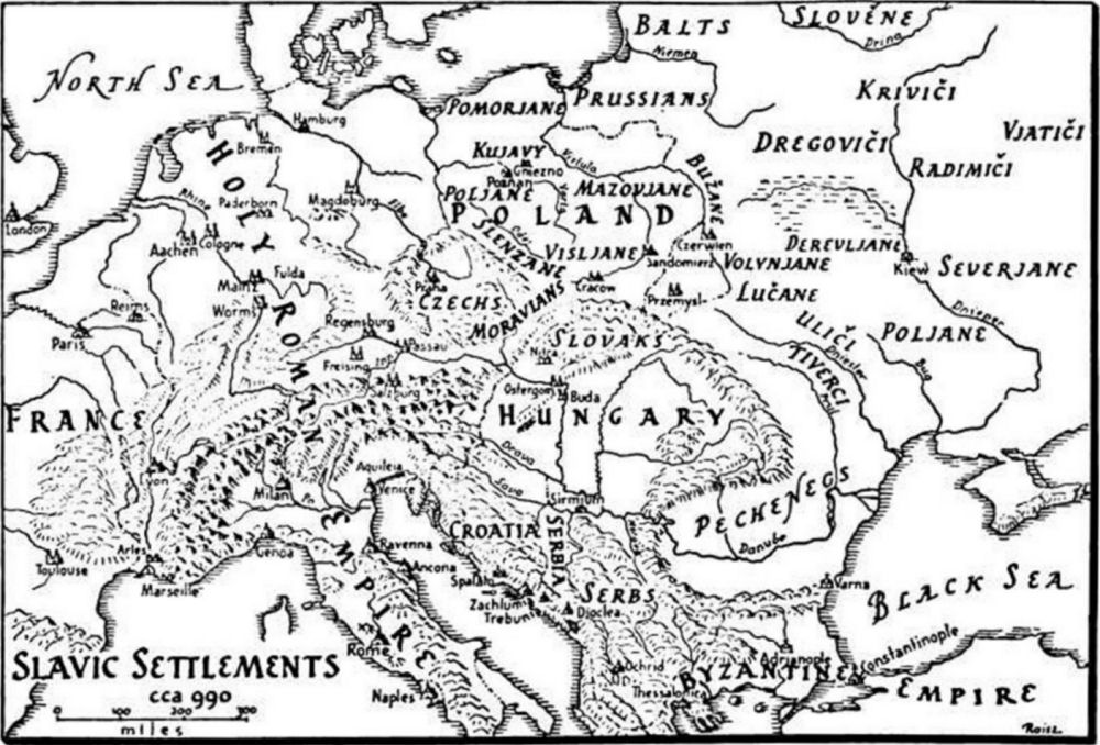 The danger was averted thanks to a new factor which entered the Eastern Slavic scene: the appearance of the Scandinavians and the Byzantines. The Scandinavians came first, making their appearance among the Eastern Slavic tribes just in time to weld them into a firm political bloc, which proved able to withstand and obstruct the westward rush of the Asiatic hordes and even to