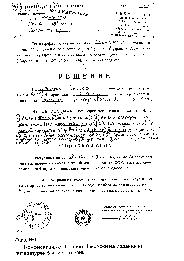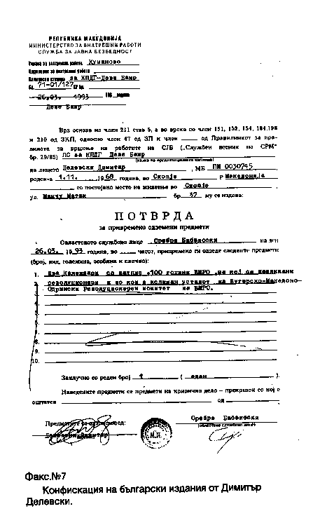 According to protocol N 239-01/339 from December 28th, 1991, many documents and photocopies in Bulgarian literary language were taken from Slavtcho Cekovski.