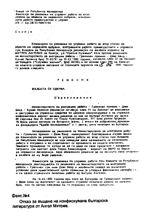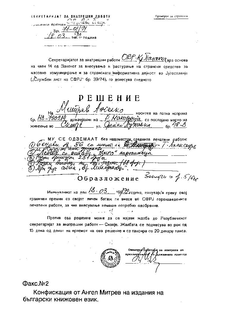 Angelko Mitrev handed to the government of the Republic of Macedonia a written objection, protesting the confiscation of his materials. But according to decision 28/11- 409/ 1-92, his complaint was rejected because: "As he admitted, he was going to spread them among his friends" (see appendix No 4).