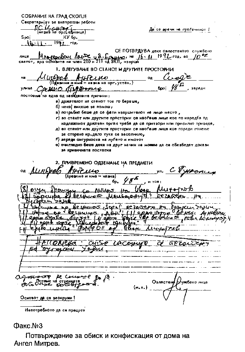 According to protocol 71-01/91 from March 18th, 1992, many Bulgarian literary language books, booklets and badges with the image of Todor Alexandrov printed on them, were confiscated from the Macedonian citizen Angelko Mitrev (see appendix No 2). On November 16th, 1992, the police conducted a search of his home and according to the protocol, found booklets with the image of Ivan Mihailov, issues of the Bulgarian newspapers "Macedonia" and "Zora" (Dawn), issues of "Macedonian Tribune", published in USA, and the book "VMRO" (IMRO) - written by Ivan Mihailov, published in Brussels, Belgium; all were taken from him. Specifically in the police protocol was written: "REMINDER: all the magazines are printed in Bulgarian" (see appendix No 3). As if using Bulgarian is a horrendous crime! Of course by the term "Bulgarian" the Macedonian police understands the Bulgarian literary norm, which for the displeasure of the Skopje regime remains easily legible and understandable even for Macedonians who come in touch with it for a first time and who by no stretch of imagination could honestly regarded it as a completely foreign language.