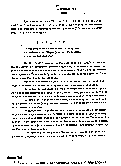 On June 2nd, 1991, Mr.Ilia Ilievski, chairman of Human Rights Party in Macedonia was arrested by the Yugoslav authorities at the Bulgarian - Yugoslav border. His party was registered on December 14th, 1990 in accordance with decision No 23-4029/ 1-90.