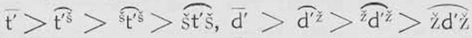 Сочетания с шч (шт’)-жд' представлены были и вместо давних праславянских *stj, *skj, *sk перед гласным переднего ряда и *zdj, *zgj, zg перед гласным переднего ряда: Брештани (4b, 4d-2 пункта), Велагошти (4b), Весочиште (4d), Градшит[а] (4b,-2 пункта, 4с), Берагожда (4d), Гождаражде (5d), — гожд < *gvoždz < *gvozdj-. Не точно заявление проф. Белича, утверждающего, что у славян Албании было только шч-ждж вместо давних *stj, *zdj . . . . Впрочем нет основания придавать сочетаниям с шч-ждж вместо *stj, *zdj и т. д. такое значение, какое видит в них проф. Белич, шч-ждж — это черта прежнего, общеславянского фонда, а не результат процесса, пережитого этими славянскими группами.