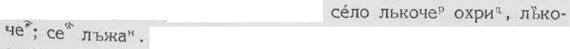 от Струги, находятся сёла Ложани, Локочере[в]и. В этих названиях представлен гласной о вместо ъ из ѫ. Но в обыденной речи тамошнего населения заменою ѫ является ъ : път, ръка. Раньше, в XVI-м веке, и в названиях этих сёл был гласный ъ, как свидетельствуют записи XVI века в Слепченском помяннике (собр. Григоровича в Одессе, № 40):