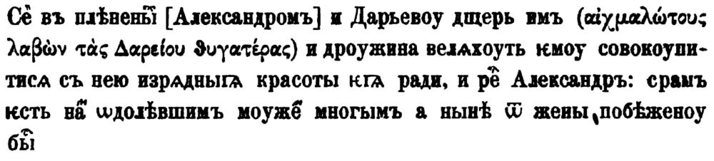 Сопоставленіе съ сербской Александріей здѣсь не можетъ имѣть мѣста, а тѣмъ болѣе не можетъ быть и рѣчи о возведеніи эпизода къ одному источнику — какой то особой греческой Александріи, такъ какъ у меня вполнѣ ясно доказано, что весь этотъ эпизодъ вмѣстѣ съ предшествующимъ общимъ взглядомъ на Александра взятъ изъ хроники Георгія Амартола, и притомъ изъ славянскаго уже перевода, съ которымъ онъ совпадаетъ буквально (см. взслѣд. стр. 237 — 8). Совпаденіе же въ плачѣ Олимпіады настолько несущественно, что не можетъ останавливать на себѣ вниманіе. Весь плачъ во второй редакціи Александріи заключается въ одной строкѣ: «и оусрѣтши Алимпіада, мт҃и его, вопіаше горко, бьющесѧ и стѣнюще». Упоминаніе о плачѣ матери надъ гробомъ Александра на столько естественно, что для него нѣтъ нужды восходить далеко — къ греческому оригиналу.