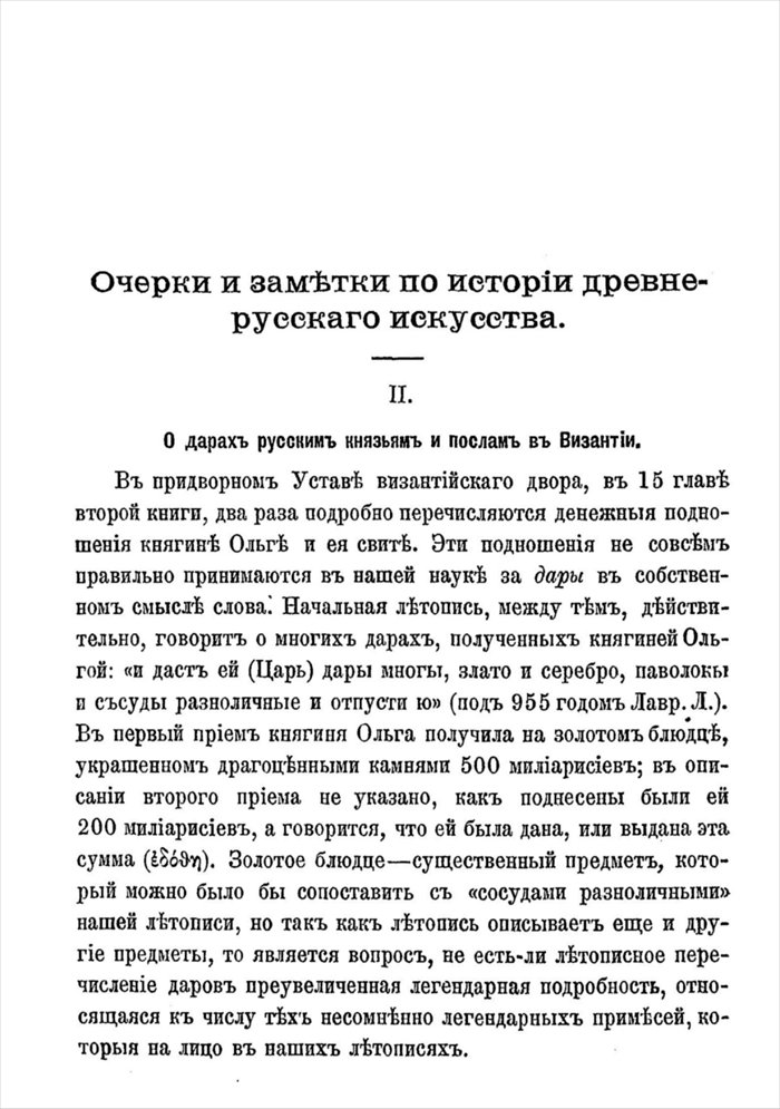 «Извѣстія о подаркахъ Ольгѣ», говоритъ онъ, «очень важны, онѣ могутъ показать намъ, какъ мы должны понимать лѣтописныя извѣстія, гдѣ говорится о многихъ дарахъ и множествѣ золота, серебра и проч.» [1].