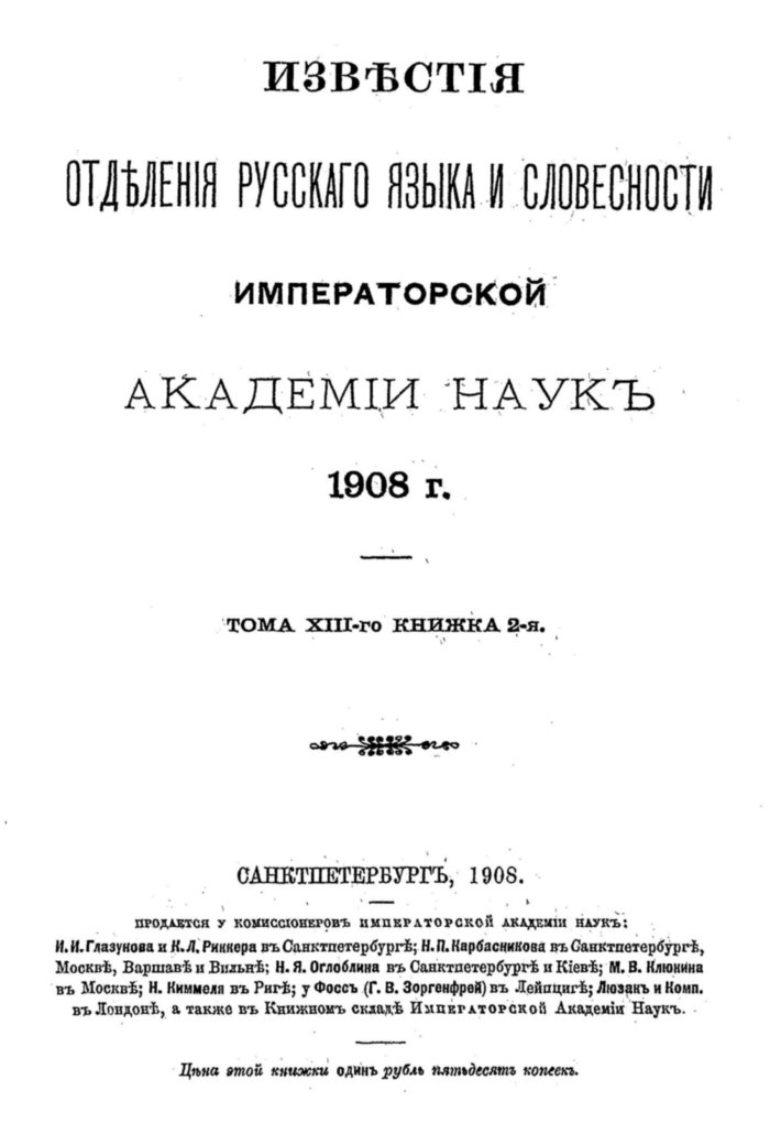 Извѣстія Отдѣленія русскаго языка и словесности Императорской Академіи наукъ, 1908 г. Тома ХІІІ-го Книжка 2-я. Санктпетербургъ, 1908, с. 290-323
