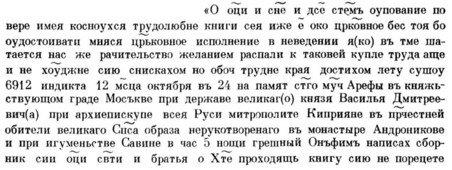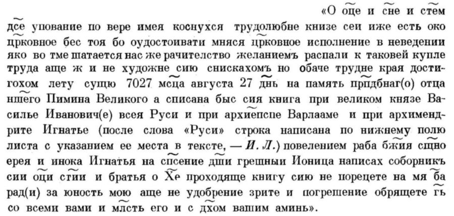 Как видим, приписка Ионицы почти дословно повторяет приписку Онфима в Син. 275. Дважды упоминаемый в приписке Игнатий был архимандритом Андроникова монастыря как раз в год создания Барсовского списка (1519). [28] Таким образом, приписка Ионицы показывает, что Синодальный список 275 был не только непосредственным протографом Барсовского списка, но и то, что Син. 275 хранился в Андроникове монастыре на протяжении всего XV и начала XVI в.