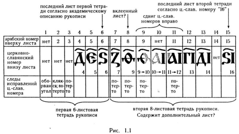 Возникает впечатление, что проводилась какая-то работа по «исправлению» этой части летописи. Это видно и из исследования Б. А. Рыбакова, см. выше. Причем Б. А. Рыбаков делает свои выводы лишь на основании анализа текста, не ссылаясь на разрозненность листов и пропуски в нумерации. Но его утверждение, что вводный раздел летописи набран из отдельных, плохо связанных между собой отрывков, имеет логические разрывы, повторы, разнобой терминологии и т. д. — полностью согласуется с тем, что (как видно на фотокопии) первая тетрадь рукописи действительно собрана из отдельных разрозненных листов, с явными следами правки церковнославянской нумерации. В половине случаев номера просто отсутствуют (рис. 1.1).